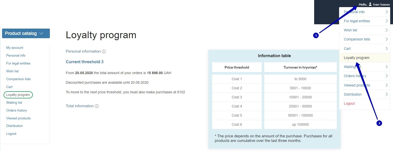General information. We offer 6 "Price Thresholds". Each threshold has its own total turnover, which is calculated based on your orders for the last 3 months. In personal information, the system shows at what price the purchase of goods is available at the moment. We also see how much you need to place an order in order to move to the next threshold and buy the product even cheaper.