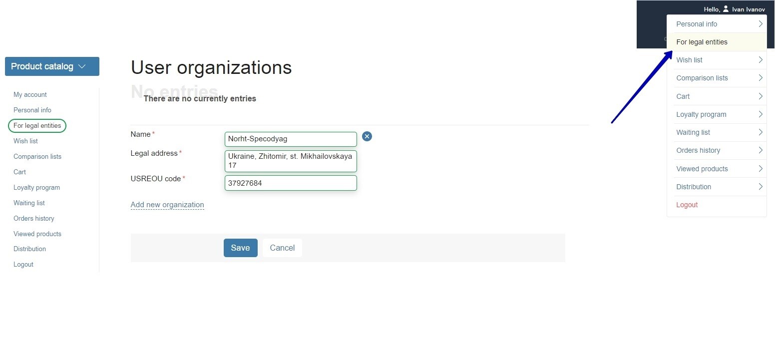 You will find the page "For legal entities" in your personal account. To make purchases on behalf of an organization (as a legal entity), you need to fill in some required data. They are necessary for the correct extract of primary documentation and registration of tax invoices.